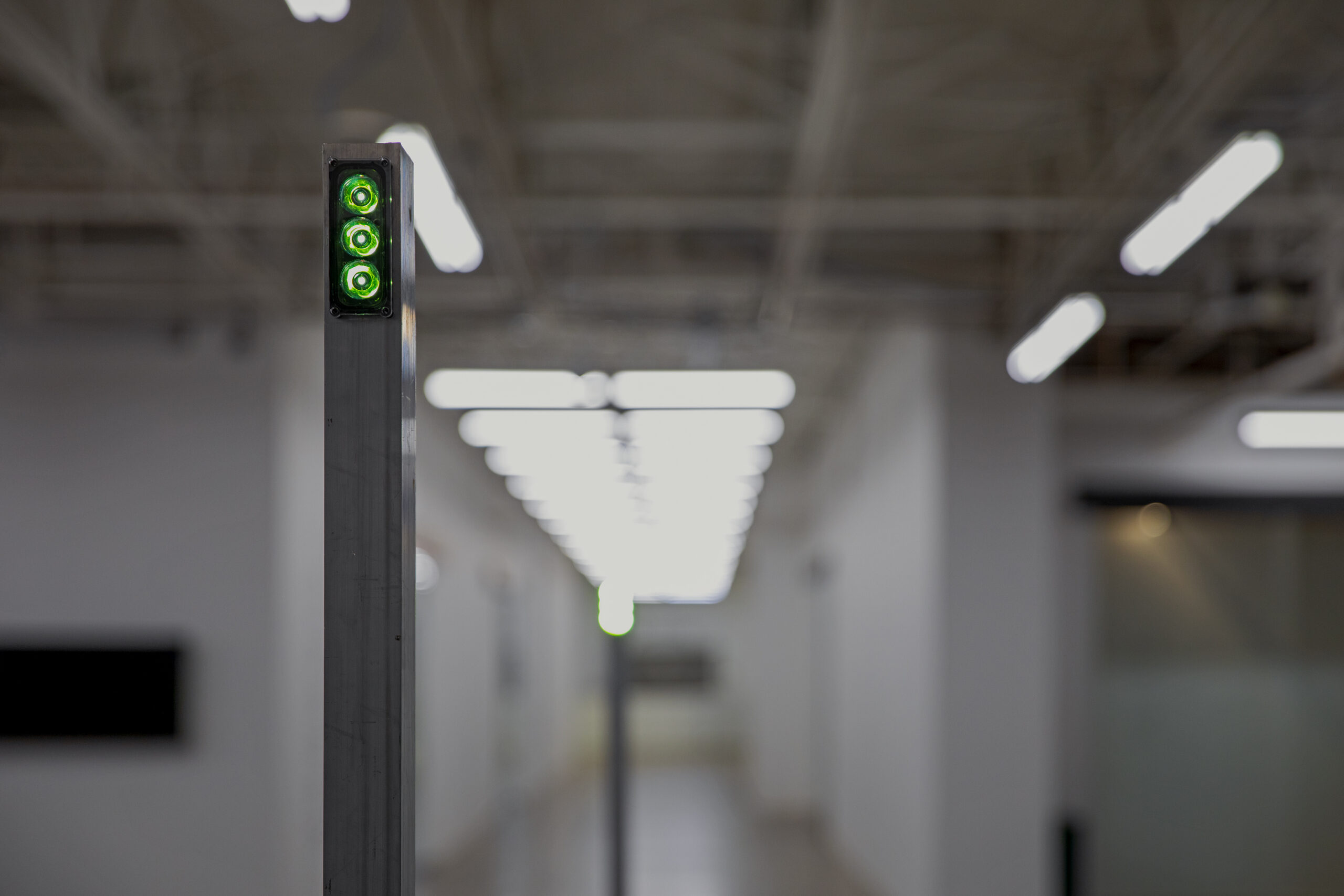 Metal beams—each capped with a single LED lamp, connected to a hidden control box—create the impression of lime green orbs, whose glow slowly rises and falls over the course of