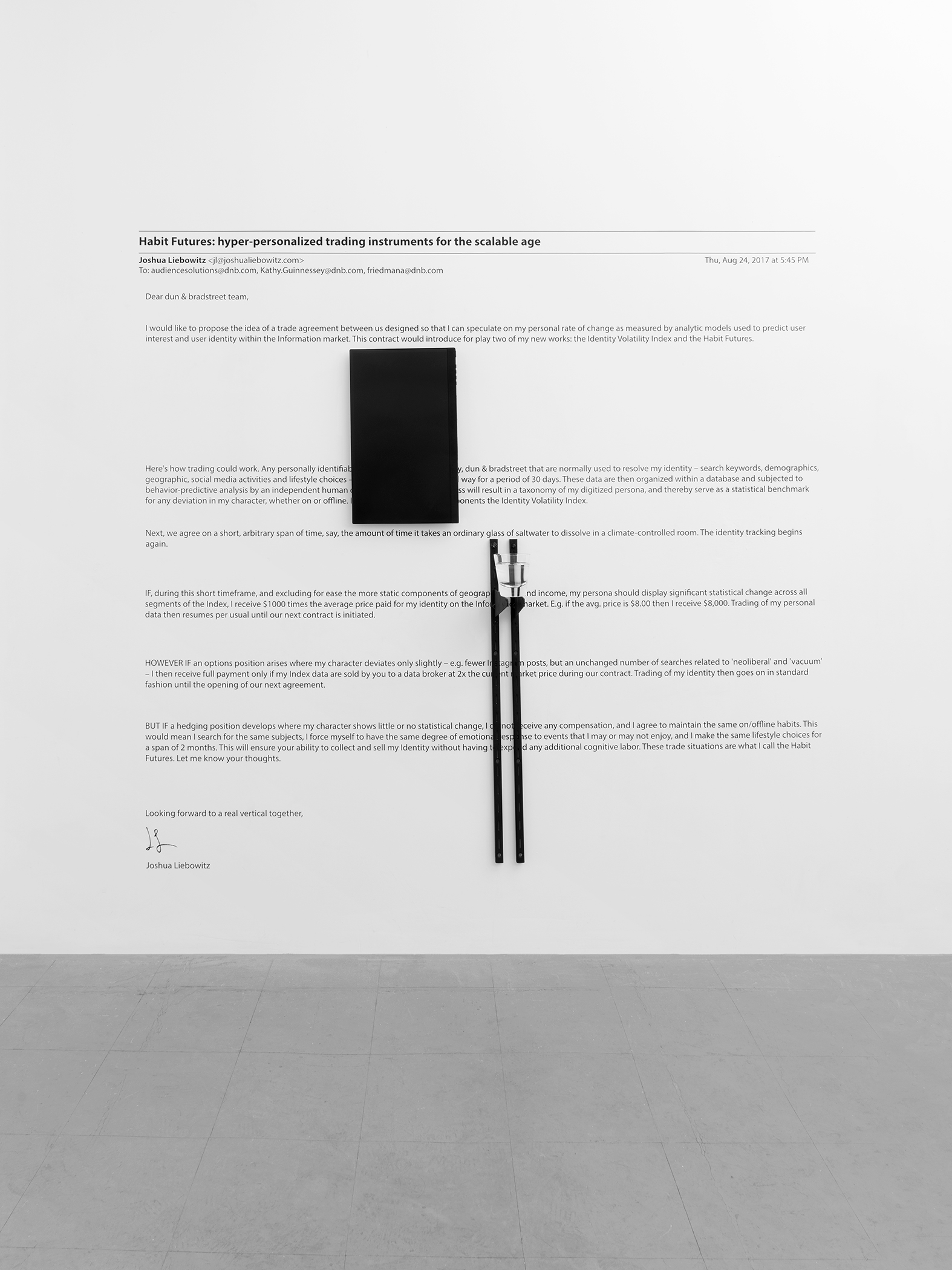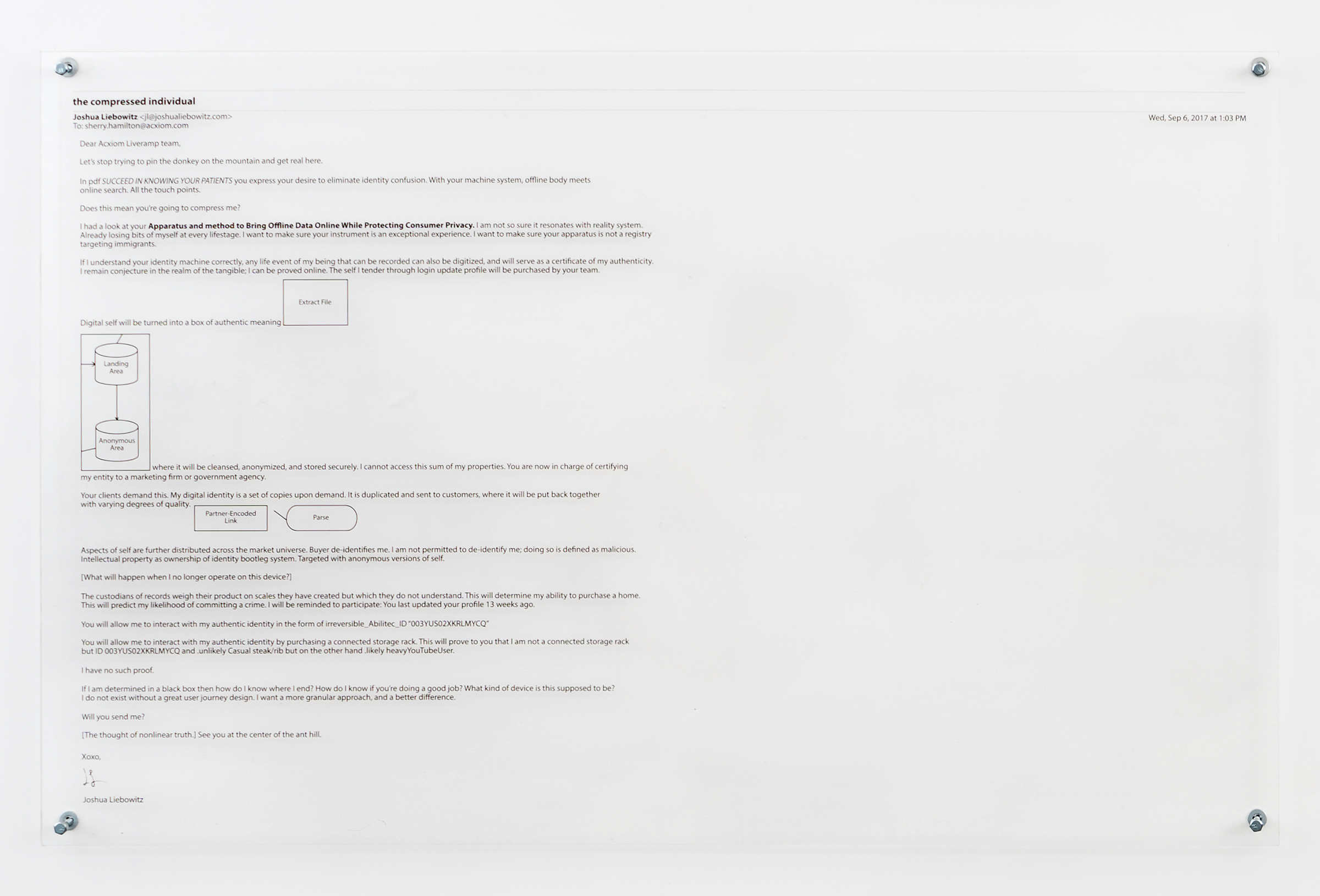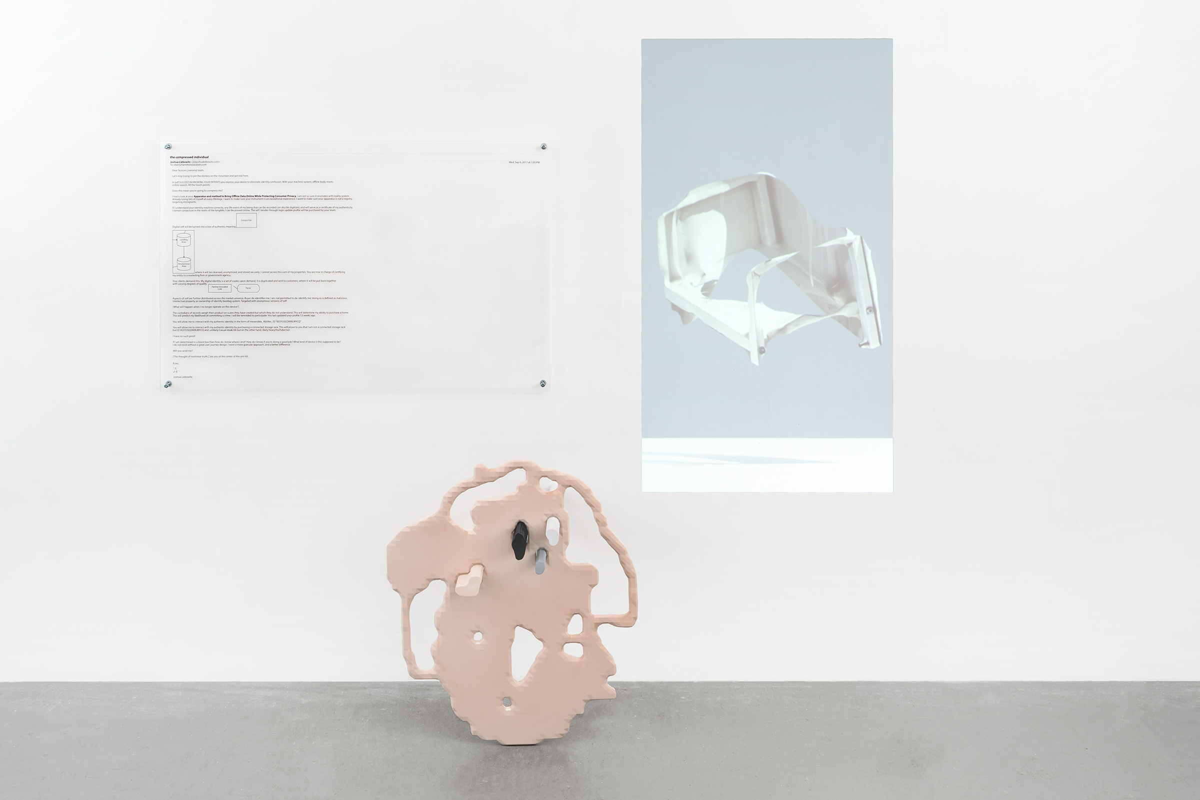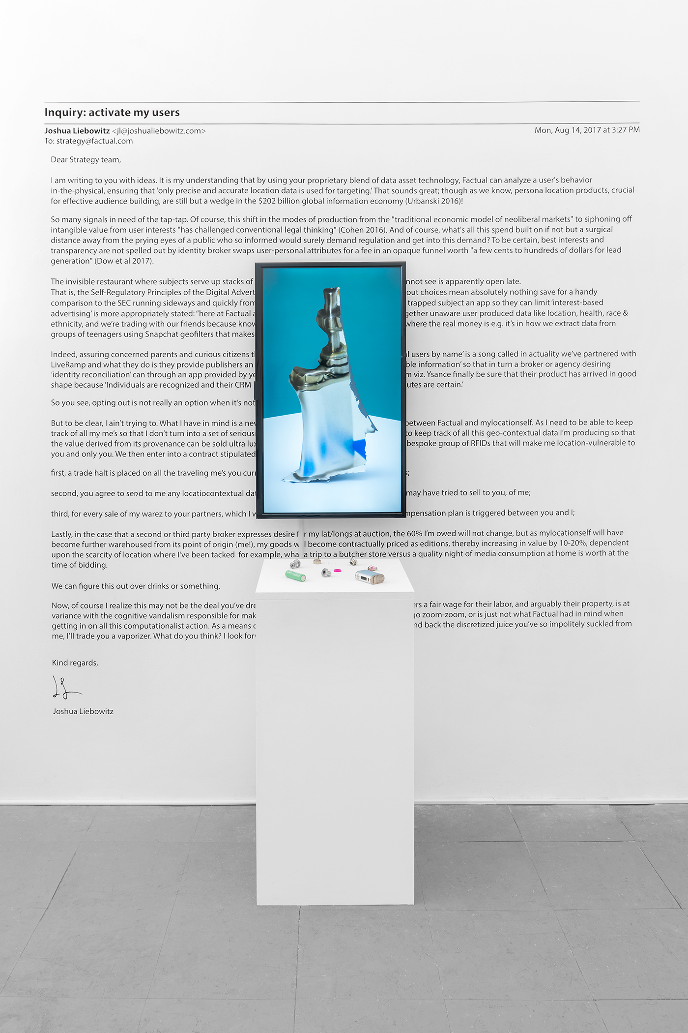 In this project I explore how financial actors in the data economy use network connections and behavioral prediction AI to exploit our preconscious labor as device users. Everyday objects like vaporizers and tennis balls are scanned into digital space using photogrammetry and 3D modeling software. These virtual copies are then further deformed through a series of procedures involving open-source image recognition algorithms. These couplings of physical and digital objects are then used as purposely absurd bargaining assets, in a sequence of heavily-researched, but equally absurd emails to various data brokerage firms, composed to renegotiate the terms of my employment, which up until now, through the buying and selling of my personal and predicted behavior data by these third party firms, has remained invisible, coerced, and by proxy. The texts of these emails, along with the physical/digital object pairs forming the bases of negotiation, are then assembled in the manner of a flowchart, aimed at emphasizing how value is abstracted from the user, without direct consent, within the data economy, while indicating the gap in being, resulting from monetizing actions, which, contrary to providing the ‘data subject’ greater knowledge about themselves, are instead effectively designed to bypass distinctions between what it means to be a person, and what it means to be an object.