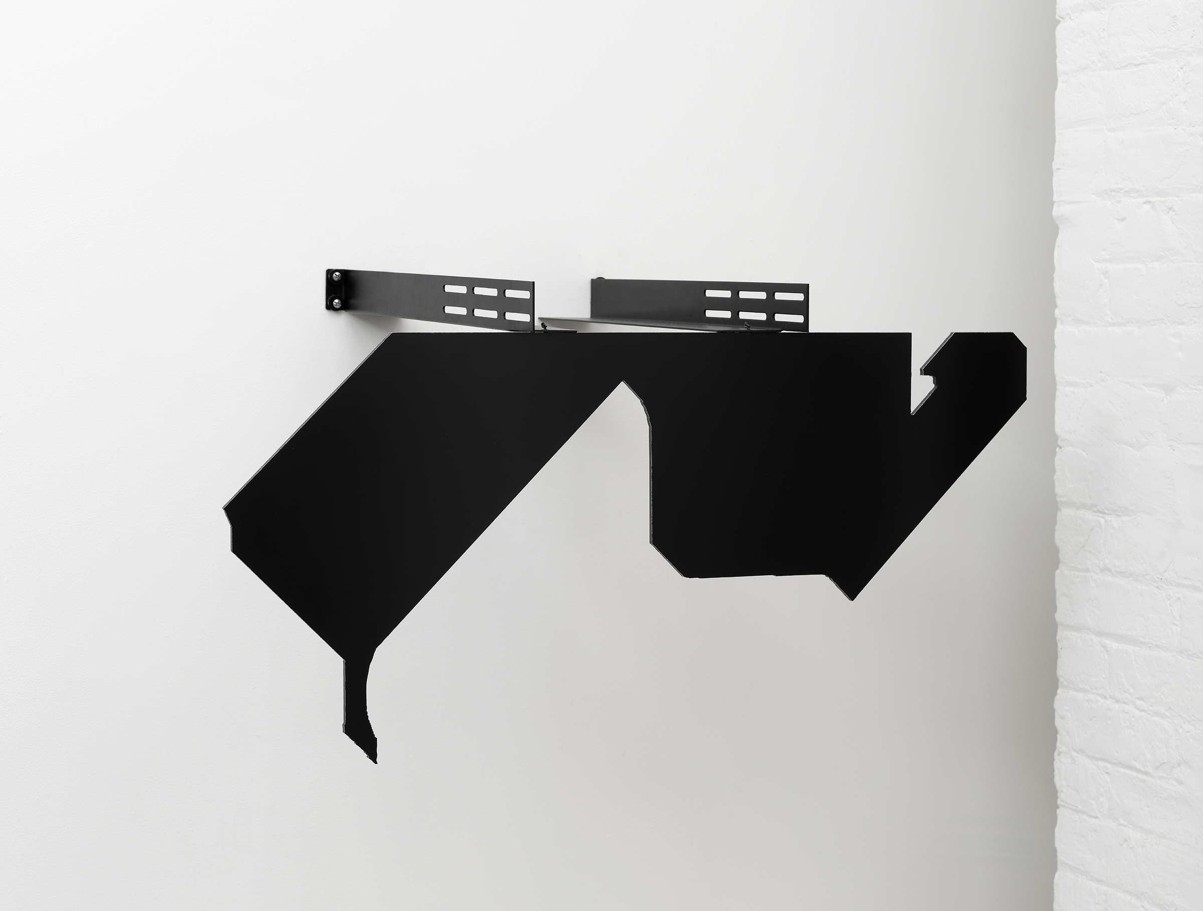 Right profile of sculpture made of black, laser-cut Dibond and black server rack rails, mounted on wall
